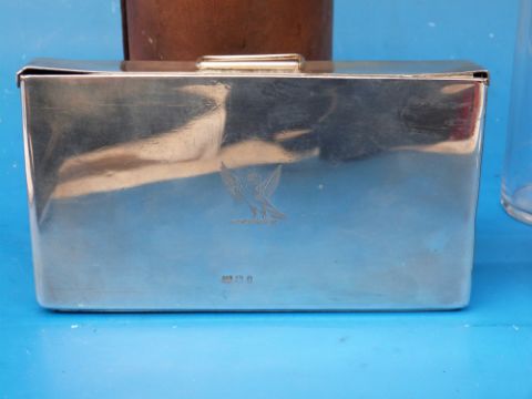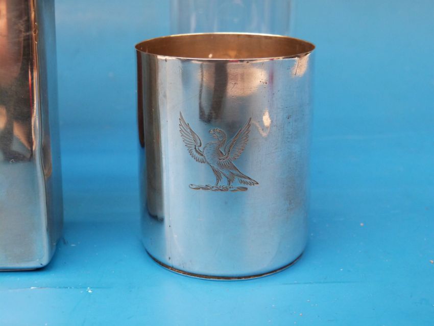A Victorian hallmarked silver hunting set, comprising sandwich box, length 16.5cm weight 355g and glass flask with cup to top and bayonet cap, height 22.5cm, both box and flask having a family crest, each Birmingham 1895 maker T.Wooley, together with a leather holder marked A.Barrett &Sons