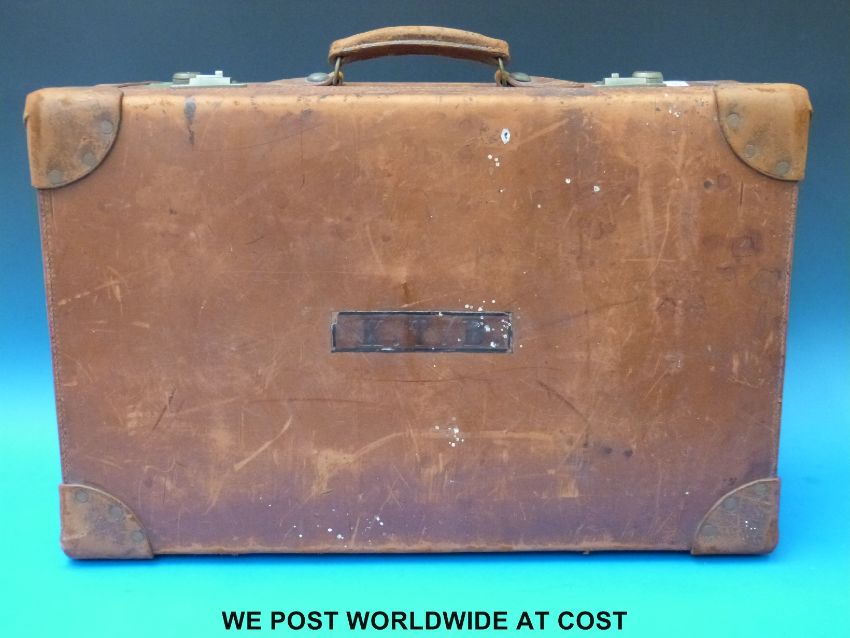 A leather suitcase with hallmarked silver and cut glass dressing table bottles fitted to interior