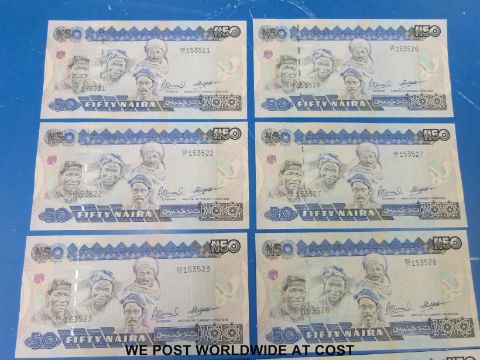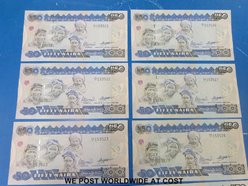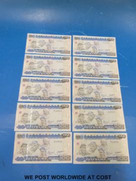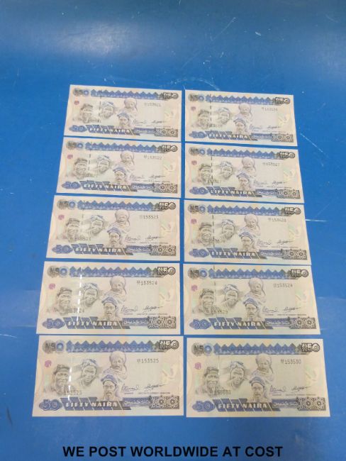 Ten Yugoslavian 1000 Dinara consecutive uncirculated banknotes together with ten Nigerian 50 Naira uncirculated examples