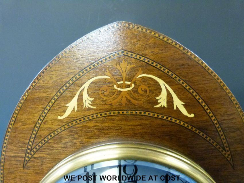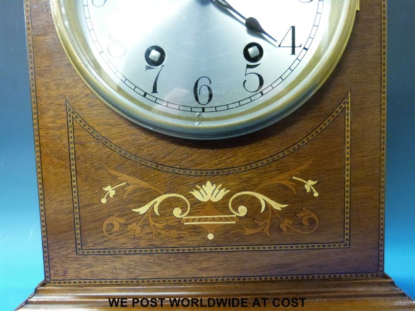 A late 19thC / early 20thC two-train mantel clock with inlaid mitre shaped case, silvered dial and striking on a gong