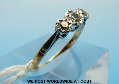 An 18ct gold ring set with three diamonds in a platinum setting (size M/N)