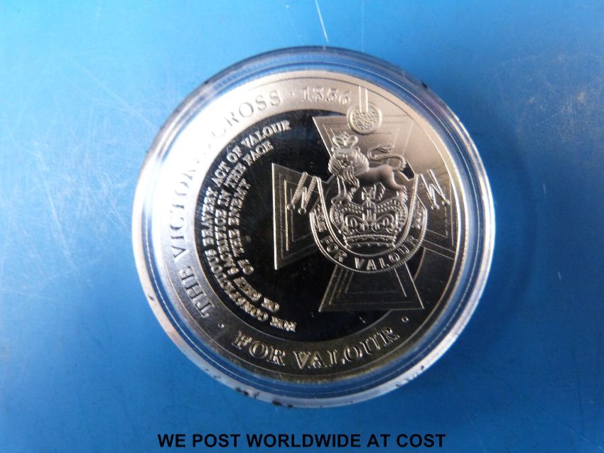 A Victoria Cross gold and silver Bradford Exchange commemorative set comprising a 9ct gold layered double crown, 22mm diameter, a sterling silver crown 38.6mm diameter and a replica medal with certificate