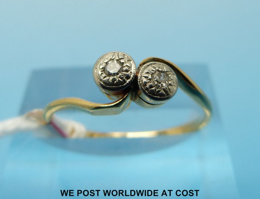 An 18ct gold ring set with two diamonds in a cross over setting (size N)