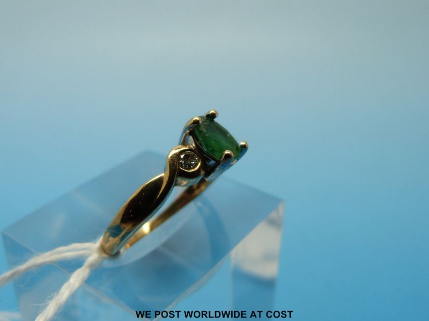 A yellow metal ring marked 9ct gold set with an oval emerald surrounded flanked by diamonds (size K/L)