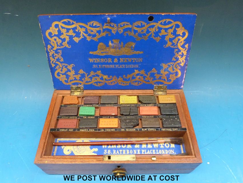 A late 19th century or early 20th century Winsor & Newton watercolour paint box, containing likely original Winsor & Newton paint blocks and with drawer below containing ceramic Winsor & Newton three section mixing dish and another dish
