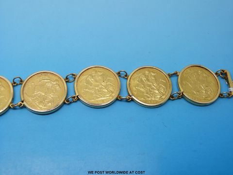 A bracelet made up of seven Victorian gold full sovereigns six being Melbourne Mint 1892,1891, 1892, 1889, 1889 and 1887 (66.7g)