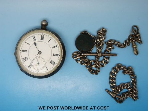 A continental silver gentleman's key wind pocket watch together with Albert, bloodstone fob etc