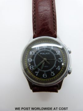 Russian Poljot gentleman's automatic wristwatch with black face, white numerals and alarm function in stainless steel case marked to the back 106121 on brown strap.
