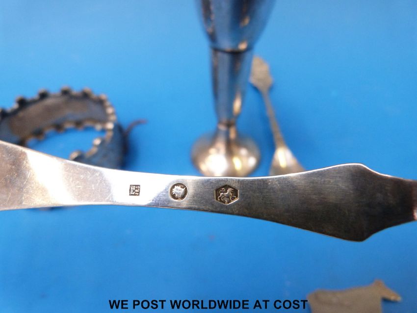 A Dutch white metal spoon with windmill to top, set of six Dutch white metal teaspoons (weight 57g) together with various white metal and other spoons, bangle, cow finial / handle and a trumpet vase
