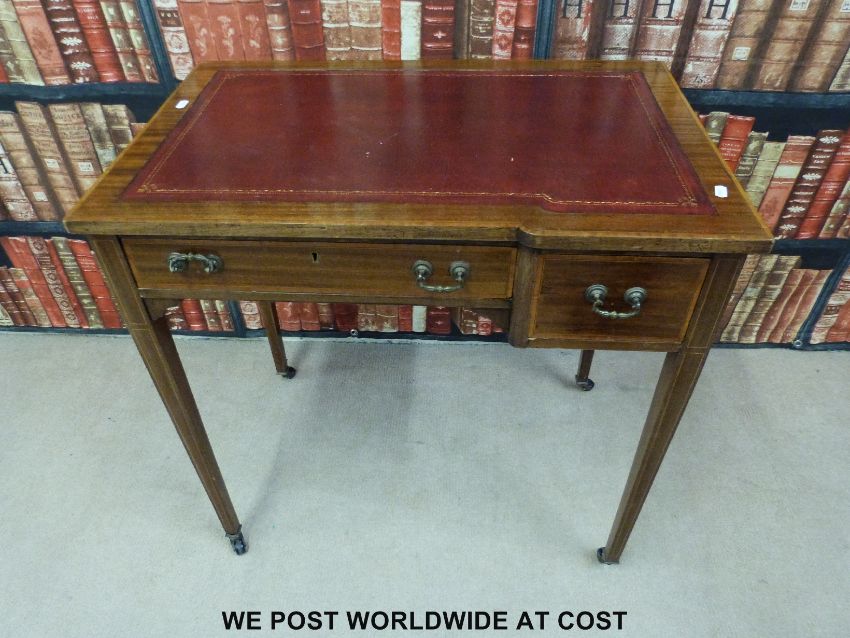 An inlaid mahogany ladies writing desk with leather inset top and two drawers, raised on square tapering legs terminating in castors (H75, W76, D51cm)