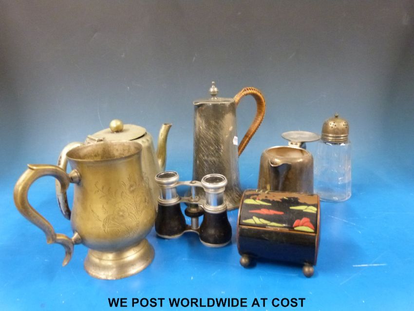 A quantity of silver plate and other collectibles including Derby Lily lidded pot, an Art Nouveau James Dixon & Sons jug, dressing table sets etc