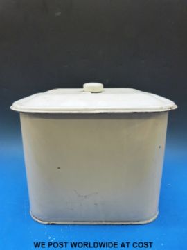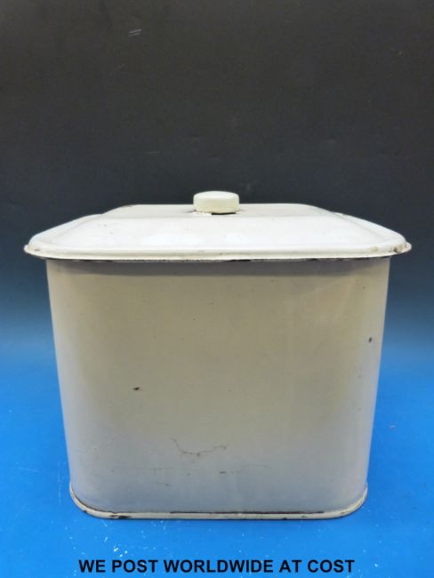 A collection of treen including turned oak candlesticks, pedestal bowl, vase, lighter, gentleman's dressing table set in leather case and an enamel bread bin etc