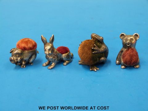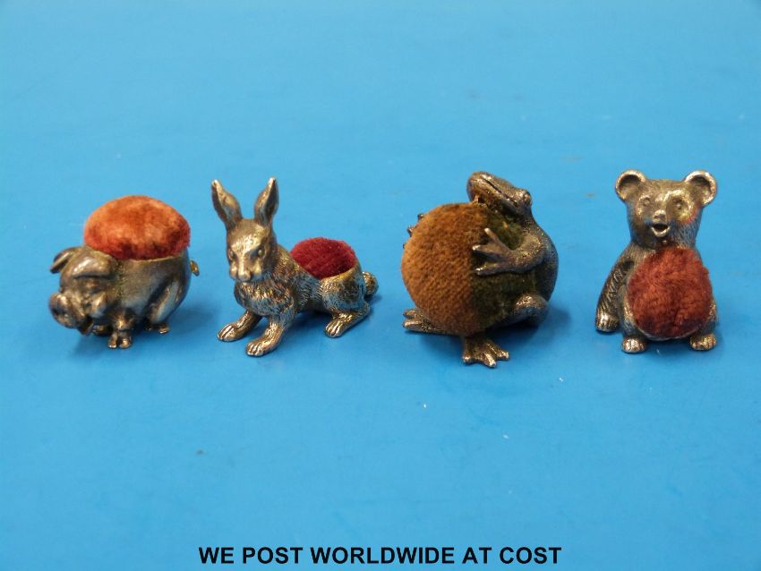 Four miniature novelty pin cushions in the form of a pig, a hare, a bear, and a frog including hallmarked and one marked 925