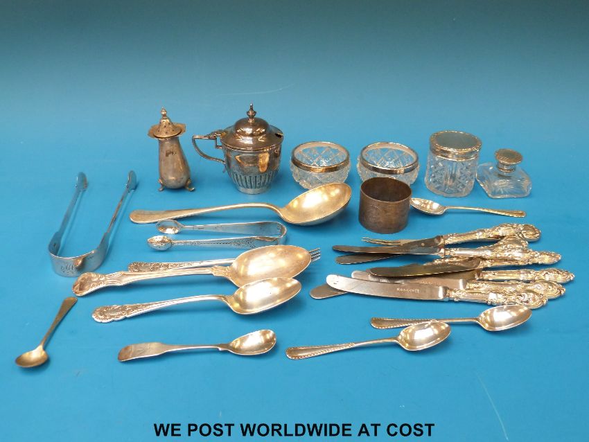 A quantity of hallmarked silver items to include Georgian sugar tongs, Mappin & Webb mustard, napkin ring etc (weight 428g) together with a quantity of silver handled knives, cut glass silver mounted items etc