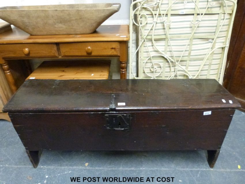 A 17thC small elm coffer or sword box, each aspect of single plank construction, raised on simple V-shaped legs (H51 x W124 x D33cm)