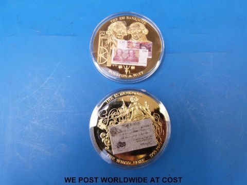 Two commemorative British banknotes coins each 50mm diameter, proof grade nos. 01320 and 04022 with certificates