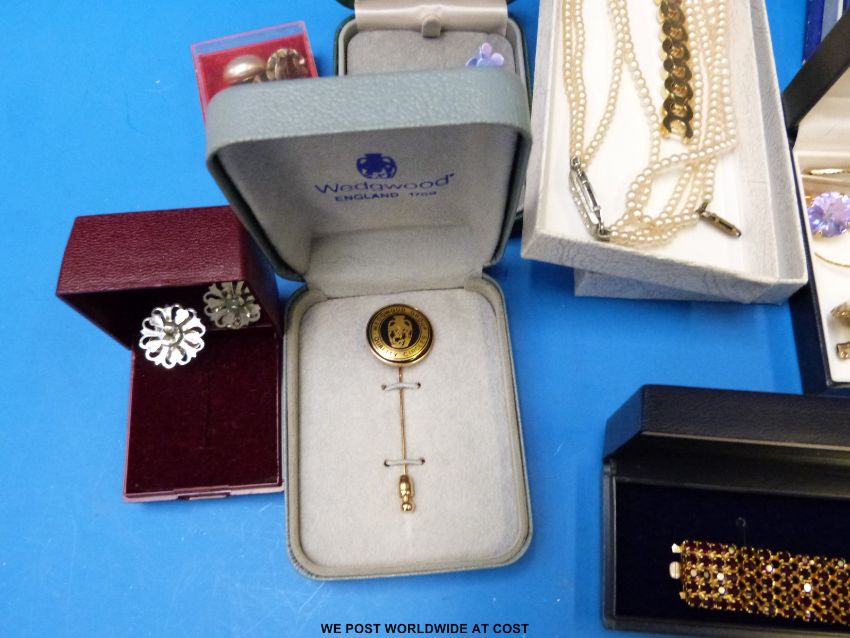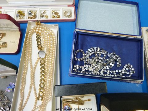 A large collection of costume jewellery to include a filigree brooch, paste brooches, diamanté necklace, large collection of earrings etc