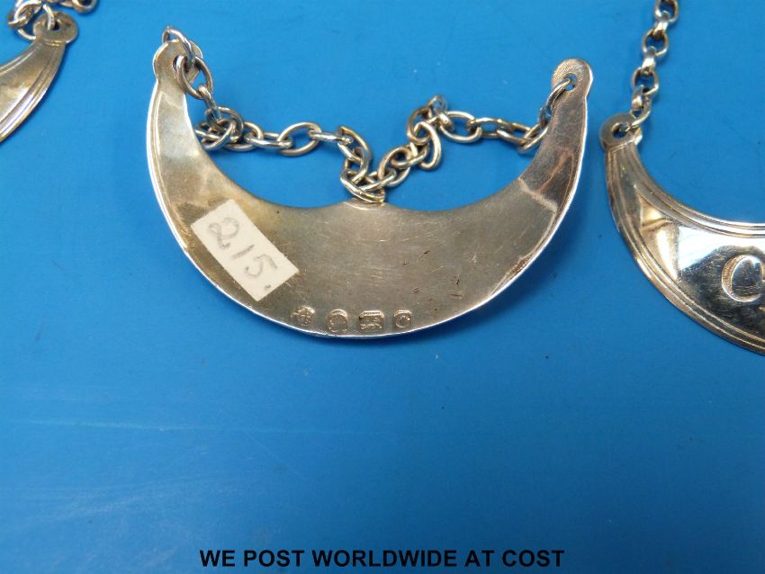 A set of three Peter and Ann Bateman Georgian hallmarked silver crescent-shaped bottle labels, two Madeira and one Claret (Ldn 1798)