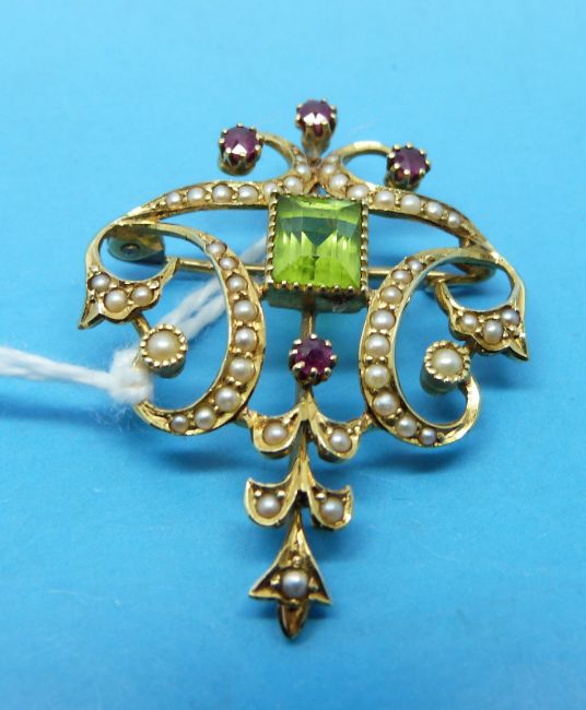 An Edwardian brooch / pendant marked 18ct set with a rectangular peridot surrounded by seed pearls and rubies 3.5x2.8cm.
