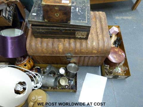 A large quantity of collectibles including travelling trunks, horse brasses, lamps, burr walnut box etc