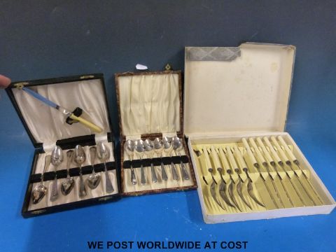 Three cased sets of silver plated cutlery including fish knives & forks, grapefruit set etc