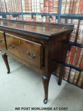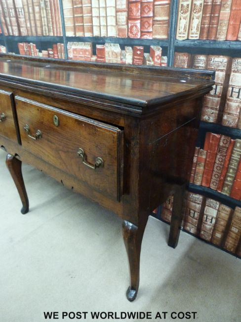 A Georgian oak three drawer sideboard / dresser base raised on cabriole legs and with a shaped apron (H88, W177, D45cm)