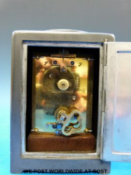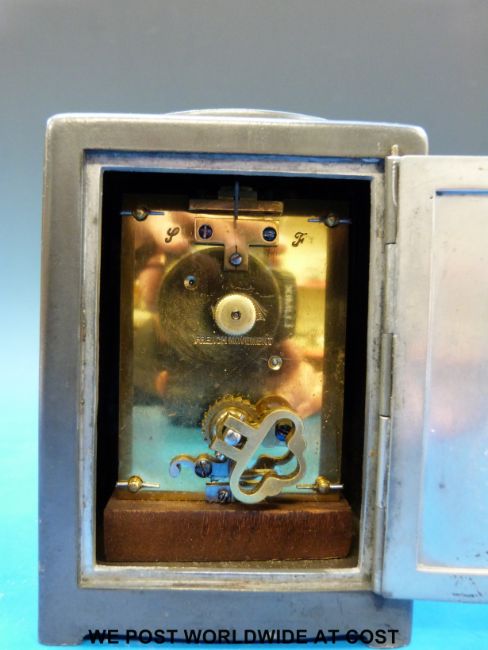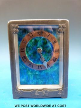 An Archibald Knox for Liberty and Co carriage clock with Arts and Crafts pewter case and copper and enamel dial. Stamped to underside of case 0721 and to the rear of movement "French movement" (height 14cm including handle)
