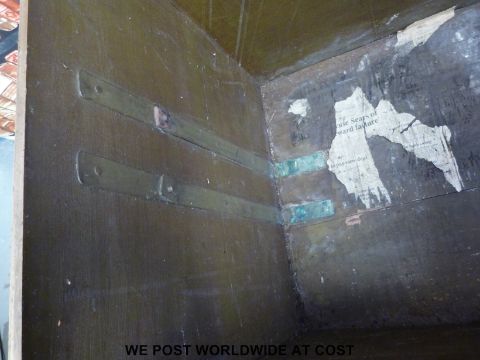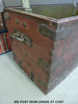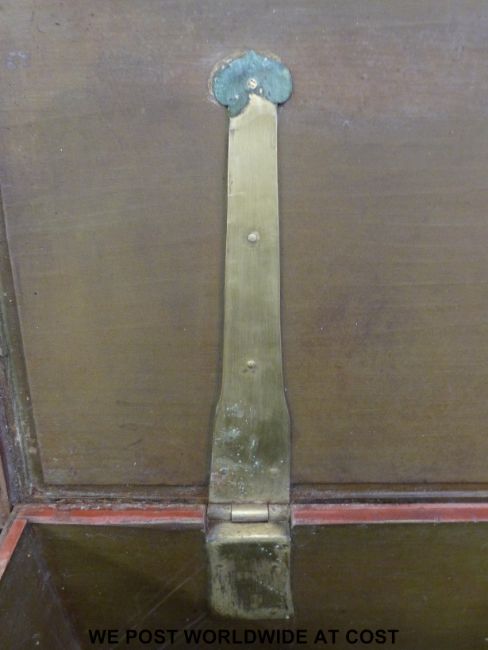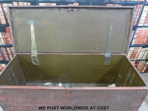 A large camphorwood possibly oriental travelling trunk with heavy brass / bronze hinges, handles and corner stops (H66, W158, D64cm)