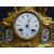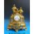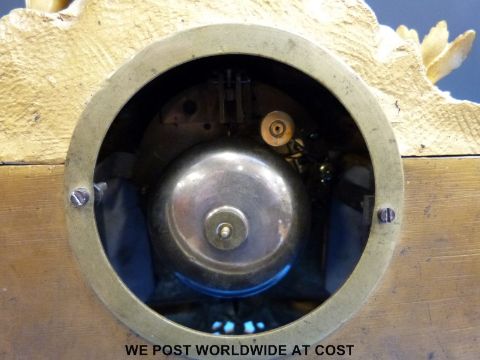 A two train brass mantel clock with Sevres style panels and two figures to the top.