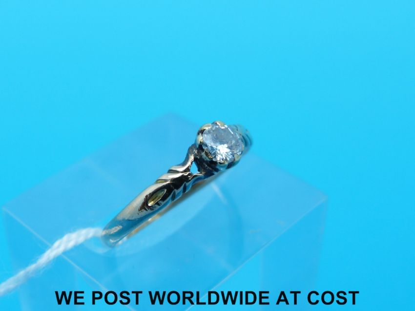 A 15ct gold ring set with a round brilliant cut diamond and patterned shoulders (size M)