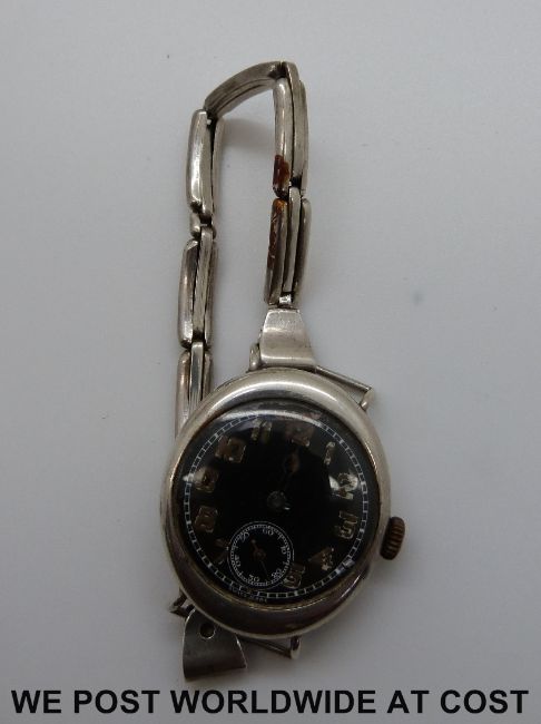 A 1920s silver gentleman's military style wristwatch with black face and subsidiary seconds dial on white metal sprung strap, marked to the inside of the case 925 JW 05933 A 113
