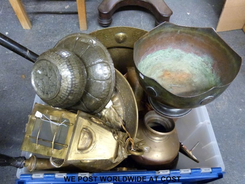 A large collection of brass and copper ware to include British Empire exhibition 1924 tea caddy and scuttles, traps, warming pan etc