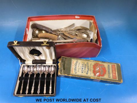 A box of plated ware, copper etc to include Guernsey cream jug, kettle, ladles, cutlery etc