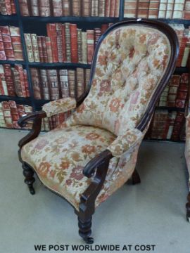 Three matching Victorian mahogany spoon-back salon chairs raised on ceramic castors