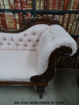 A 19thc carved mahogany pink upholstered chaise longue (Length 192cm)