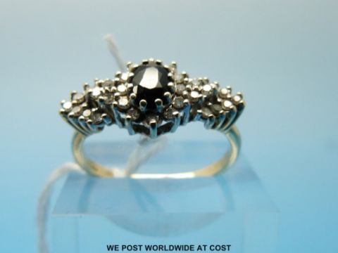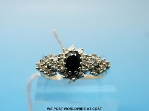 A 9ct gold ring set with an oval sapphire surrounded by diamonds (size M)