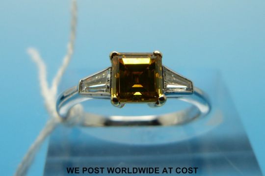 A platinum ring set with a laboratory grown square cut yellow diamond of approximately 0.86ct flanked by a diamond to each side (size L, with certificate)