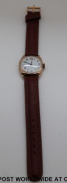 A c1920 gentleman's 9ct gold wristwatch with white enamelled dial in cushion shaped case on brown leather strap