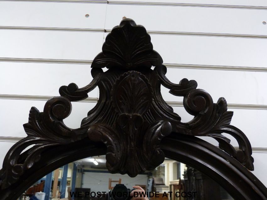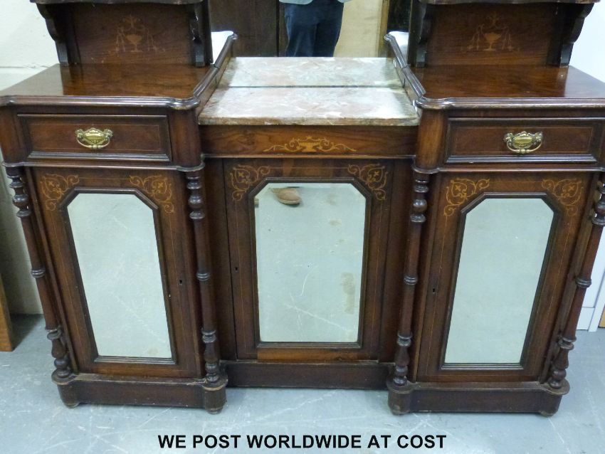 A 19thC walnut inlaid chiffonier having central arch topped mirror flanked by two oveal bevelled mirrors, the breakfast base fitted central mirror door cupboard with cupboard and drawer to each side (H200, W150, D41cm)