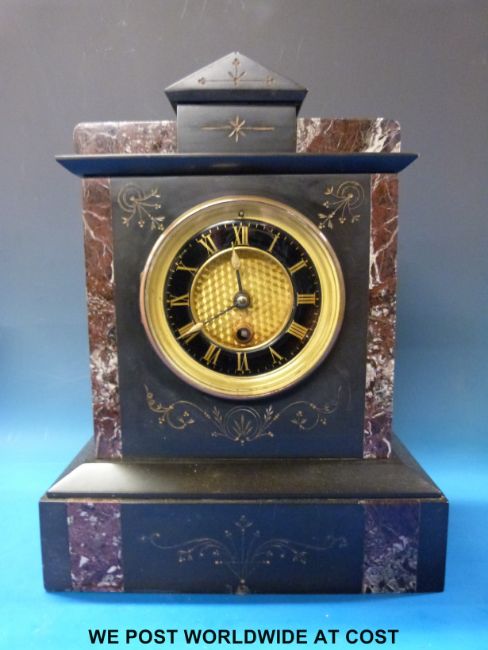Four various clocks including a black marble example, two train mantel clock etc
