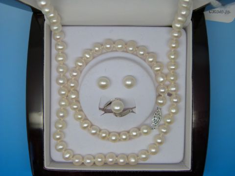 A cased suite of pearl jewellery comprising necklace, bracelet, earrings and ring