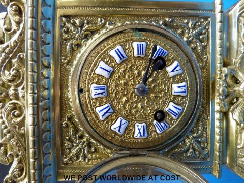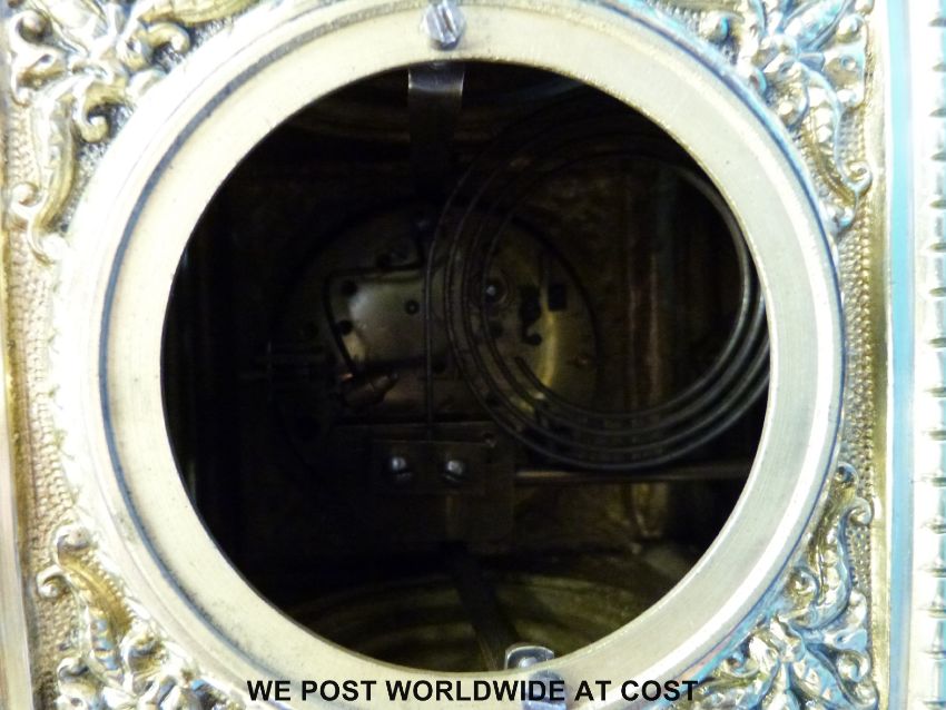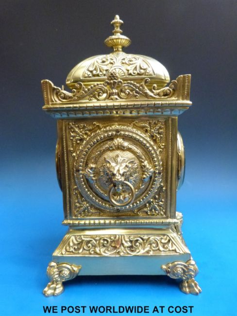 A French brass-cased mantel clock with Brevete Sonnerie movement, raised on lion paw feet, lion head handles to case