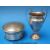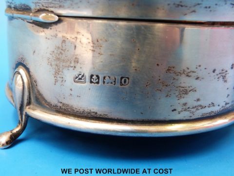 A hallmarked silver dressing table pot on three feet (11cm diameter) together with a hallmarked silver trophy cup (height 14cm, 93g)