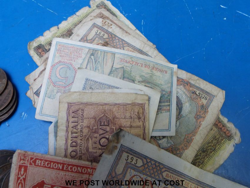 A collection of world coins, pennies Victorian onwards and bank notes
