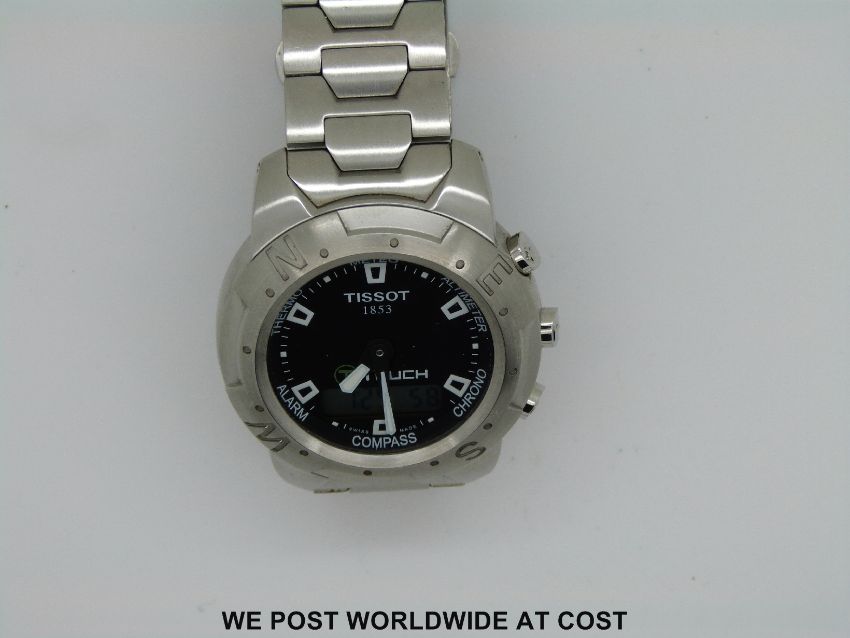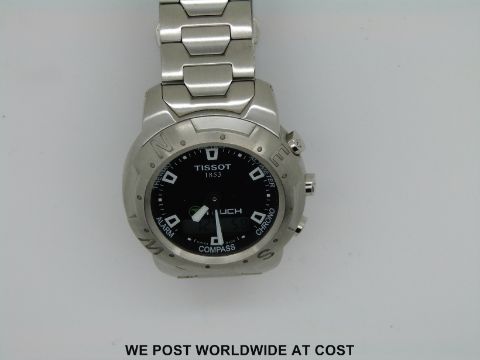 Tissot T-touch gentleman's wristwatch with digital screen set into black touchscreen face on stainless steel bracelet, with original user manual