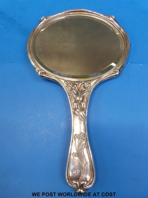 A hallmarked silver Art Nouveau dressing table mirror marked Rd522575, two hallmarked silver dressing table items, a pair of Asprey silver plated nesting cups, a sandwich box and a quantity of plated cutlery including some sets