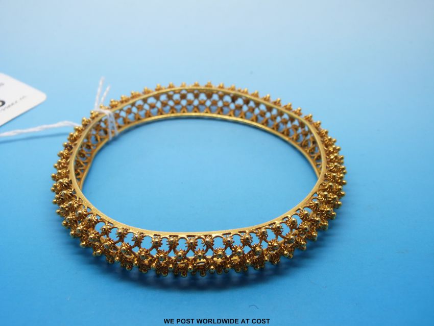 A yellow metal bangle of lattice design with small raised gold spheres (unmarked but possibly 22ct, 45.9g)