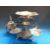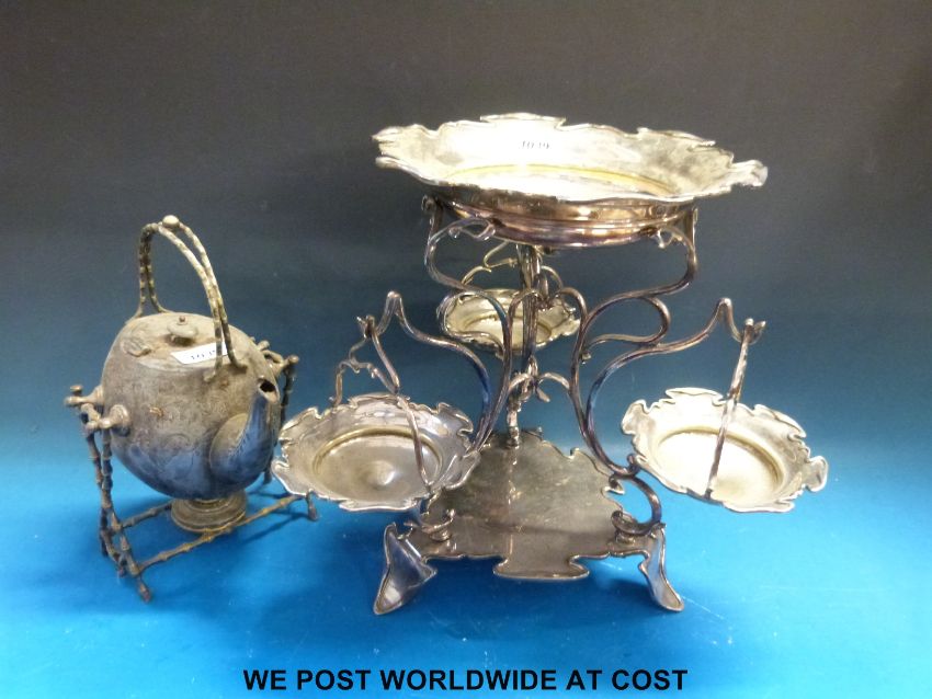 A plated Art Nouveau epergne style serving stand with three hanging dishes and a plated spirit kettle (height 33cm)