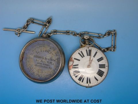 John Pitt of Tetbury gentleman's silver pair-cased 1819 pocket watch with verge escapement, fusee movement and pierced and masked balance cock, all on a silver Albert. The maker serviced and wound the Tetbury church clock in the early 19thC