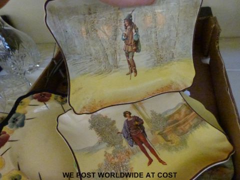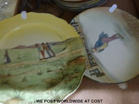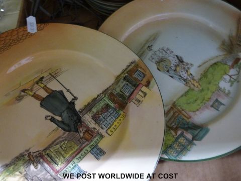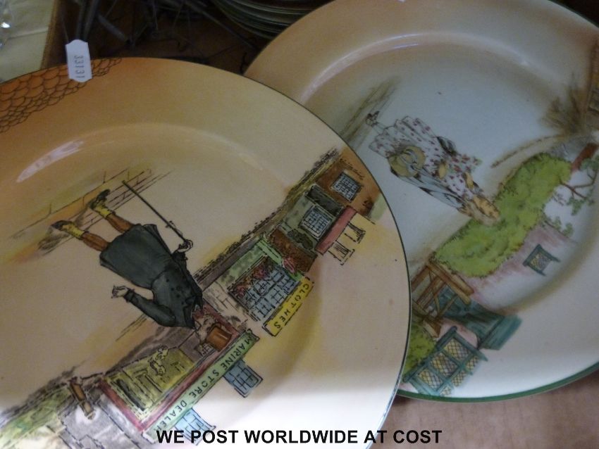 A collection of 20 Royal Doulton plates, dishes and twin-handled sucrier. Includes Pansy pattern, Seriesware, Gleaners under the Greenwood Tree, Dickens, Zunday Zmocks, Romeo and Juliet, Temple Bar, Shakespeare etc